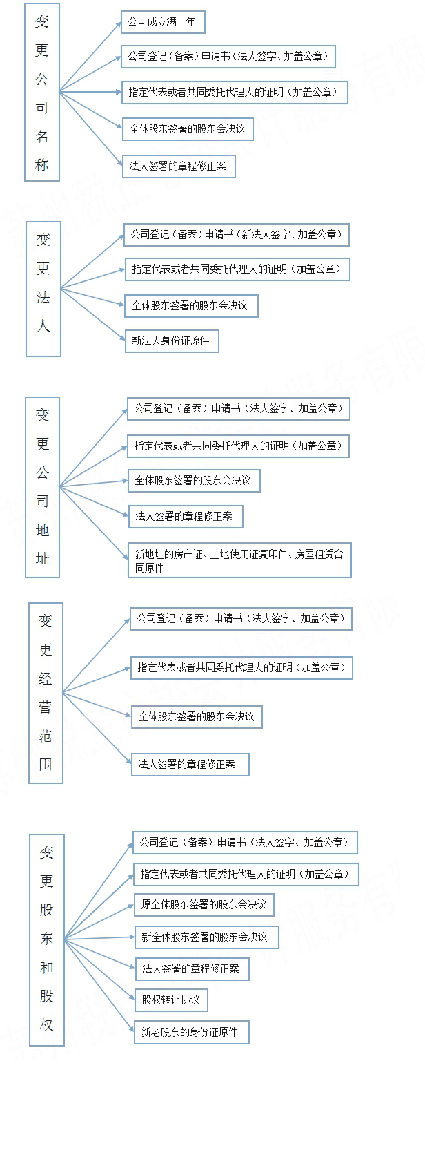 以下为内资有限公司工商营业执照变更的基本事项与所需资料, 且均需要变更组织机构代码证与税务登记证相关内容,客户须提供营业执照正副本原件、组织机构代码证正副本原件及IC卡、税务登记证正副本原件、公章,如还需要变更开户银行信息,须提供开户许可证、法人章、财务章、印鉴卡及机构信用代码证。 另有变更外资公司、股份有限公司、分公司等或其他具体事项, 请拨打公司电话咨询详情。